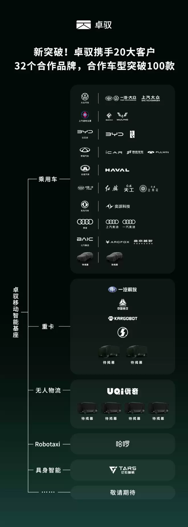 近日,卓驭科技宣布了一项新的里程碑:截至目前,其合作客户增至20家,覆盖32个合作品牌,累计量产车型50+,定点合作车型正式突破100款。尤为值得关注的是,其业务版图已从乘用车延伸至重卡、无人物流车等更加多元的领域。在行业普遍面临降本压力与技术路线焦虑的当下,卓驭的这一步跨越,是其“移动智能基座”从概念迈向实质的关键印证。