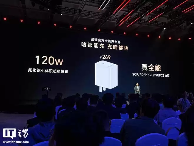 荣耀还带来了 120W 氮化镓小体积超级快充器,支持 SCP / PD / PPS / QC / UFCS 协议,售价 269 元。荣耀最新表示,Magic V6 手机用户可以免费拿到这款充电器。