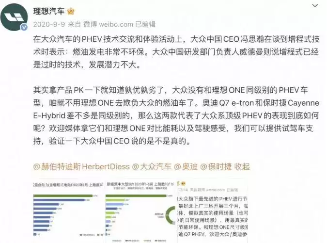 时间回到2020年9月,大众中国CEO冯思瀚在一次技术交流会上直言,增程技术“从单车角度看有一定价值,但一旦放到国家和地球层面来看,简直是胡说八道,是最糟糕的方案”。其研发部门负责人威德曼更是补充道,增程已是过时技术,发展潜力有限。彼时理想汽车刚推出首款增程式车型理想ONE,面对行业巨头的公开否定,理想团队承受了巨大压力。据内部人士透露,硬哥(理想品牌公关负责人)当时曾通过社交媒体发文反驳,但声音很快淹没在“增程落后”、“过渡方案”的质疑声中。