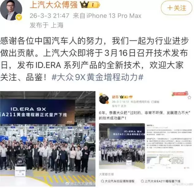 六年后,理想汽车凭借增程路线已在市场站稳脚跟,硬哥在近期公开调侃大众“自我打脸”,引发网友热议。有评论称:“质疑理想、模仿理想、成为理想,大众恐成汽车界诺基亚。”面对这波舆论,大众高管展现高情商回应:一方面感谢中国汽车人的努力,强调技术需服务于用户体验;另一方面宣布上汽大众将于3月16日举办技术发布日,推出ID.ERA系列全新技术。这一回应既化解了尴尬,又为新品发布造势,被业内评价为“大气且智慧”。