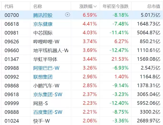 3月10日,港股主要指数午后涨幅扩大,恒生科技指数涨超2%,恒生指数涨1.8%。个股方面,腾讯涨超6%,京东健康、中芯国际涨超4%,哔哩哔哩、地平线机器人、华虹半导体、阿里巴巴涨超3%,联想集团、小鹏汽车、京东集团、网易、百度、快手涨超2%。