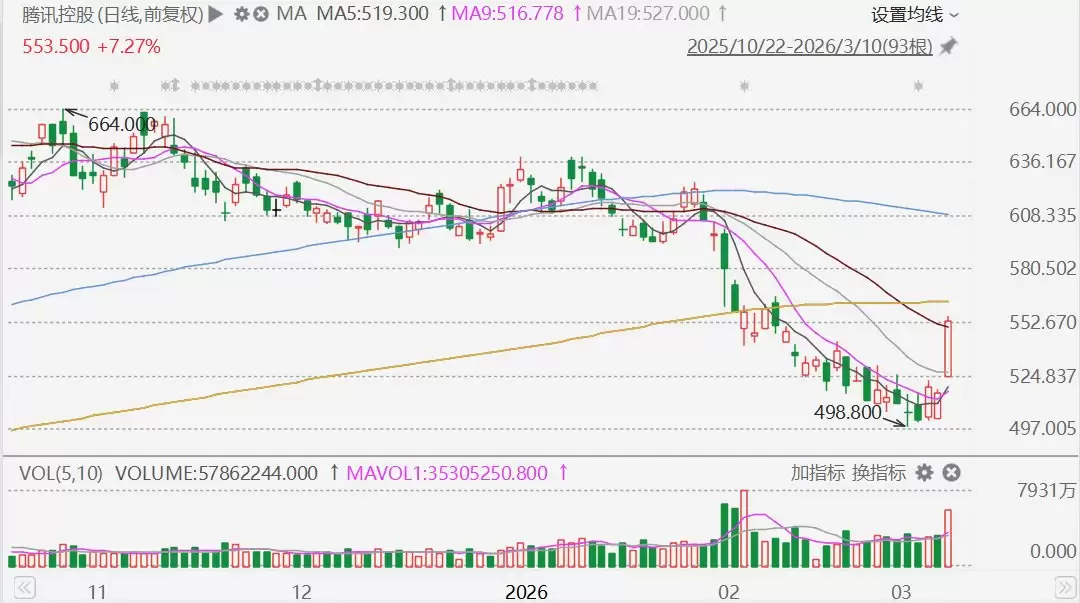 格隆汇3月10日丨入选2026年格隆汇"下注中国"十大核心资产名单的腾讯(0700.HK),今日收涨7.27%,报553.5港元,创2025年3月6日以来最大单日涨幅。