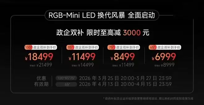 即日起开启预售,其中75/85/100英寸版本3月25日正式开售,65英寸版本4月13日正式开售。