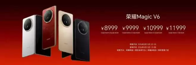 荣耀Magic V6,12GB+256GB版本8999 元、12GB+512GB版本9999 元、16GB+512GB版本10999 元、16GB+1TB 版本11999 元。