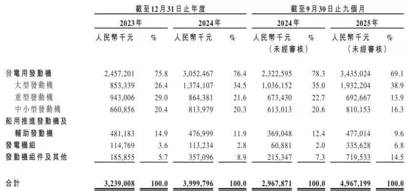 2024年至2025年1-9月,玉柴船电来自发电用发动机产品的收入占比有所下降,但仍维持在70%左右;船用推进发动机及辅助发动机的收入占比略有下滑;发动机组件及其他产品的收入占比则有所提升;而发电机组的收入占比较低。