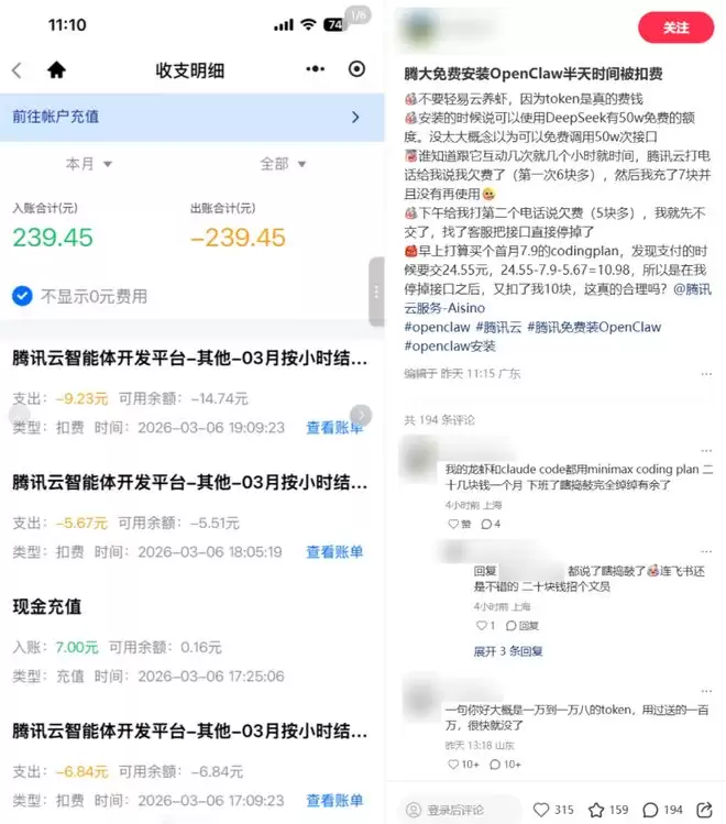更重要的是,OpenClaw 执行任何一项简单指令都伴随着 Token 的急速消耗——一些不明就里的“小白”用户,周五刚抢着让腾讯免费安装 OpenClaw,周六就发帖吐槽,不仅免费额度已经耗尽,不到一天还倒欠了十几元费用。
