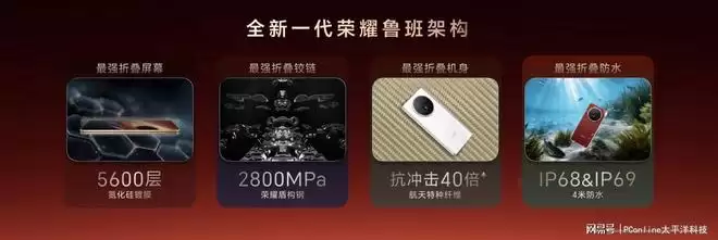 该机搭载全新鲁班盾构钢铰链,材料屈服强度达到2800MPa,相比上一代进一步提升。通过桥面式铰链结构设计,铰链开孔率降低至约8.13%,在提升屏幕支撑平整度的同时减少折痕产生。此外,新机还支持IP68与IP69防尘防水认证,并实现最高4米防水能力,在折叠屏产品中较为少见。