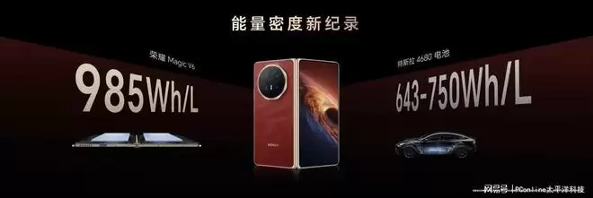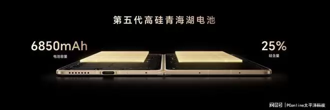 除了轻薄外形,续航能力也是荣耀Magic V6的核心升级点。新机首次将折叠屏电池容量带入7000mAh+时代,其中1TB版本搭载新一代青海湖刀片电池,典型容量达到7150mAh,其余版本则配备6850mAh青海湖电池,该电池体系硅含量最高达到32%,能量密度达到985Wh/L,还打破了可量产高硅电池三项纪录,其技术领先行业两代。