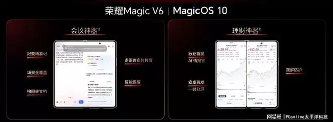 而在AI生产力方面,荣耀Magic V6进一步强化折叠大屏优势。系统支持PC级三分屏多任务操作,并加入AI一屏盯双股、AI情报官、AI翻译、窥屏防护等功能。此外,设备还支持苹果生态互联和多设备互传,在办公和跨平台协作方面提供更多可能性。