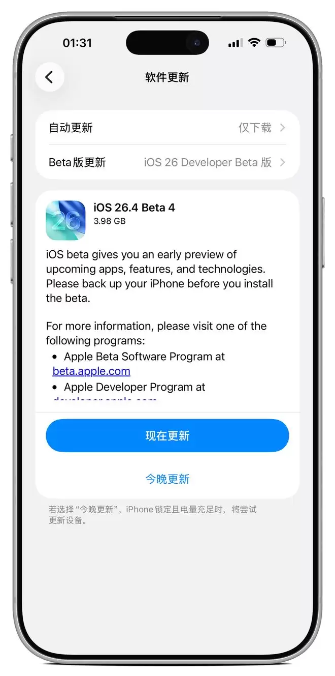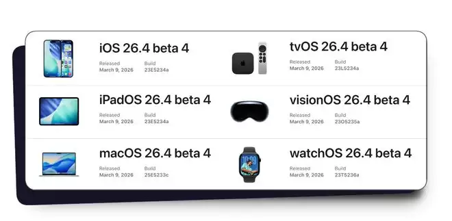 苹果在今天凌晨向参与测试的设备推送了最新一轮开发者测试版更新,其中包括iOS 26.4 Beta 4,同时发布的还有其他平台的测试版系统。