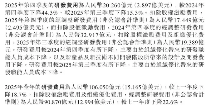 研发费用方面,蔚来2025年第四季度的研发费用为人民币20.260亿元,同比下降44.3%、环比下降15.3%。蔚来2025年全年研发费用为人民币106.050亿元,同比下降18.7%。