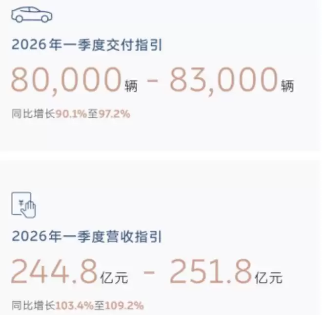 营收指引方面,蔚来方面给出的2026年第一季度营收指引为人民币244.8亿元至251.8亿元之间,同比增长103.4%至109.2%。
