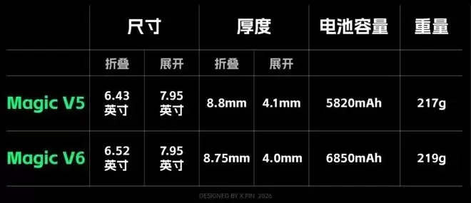 而在机身控制上,Magic V6 的尺寸和重量,也依然处在折叠屏的第一梯队。对比上一代,虽然电池增加了 1000mAh,但基本不影响机身的轻薄。