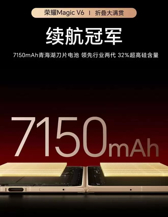 但荣耀的这台折叠屏就比较离谱了,16GB+1TB 版本的 Magic V6,电池容量直接做到了 7150mAh,这都能跟直板旗舰正面掰手腕了,而且机身还做得更轻更薄。