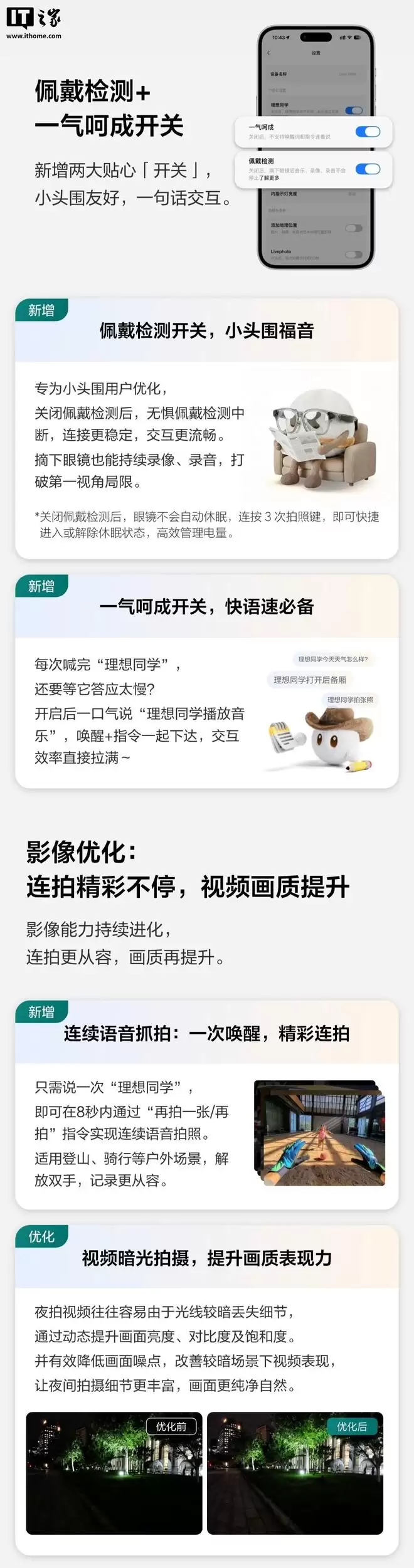 新增佩戴检测开关:关闭该功能后,眼镜在未被佩戴时也不会自动进入休眠状态。此时,连续按动三次拍照键,即可快速唤醒或重新进入休眠。新增一气呵成开关:开启后,只需一次唤醒词就能直接下达指令,无需等待应答,交互更加连贯高效。新增连续语音抓拍:只需说一次“理想同学”,即可在接下来8秒内,通过“再拍一张”或“再拍”等语音指令实现连续拍摄,特别适合登山、骑行等双手不便的户外场景。优化视频暗光拍摄:通过动态提升画面亮度、对比度及饱和度,并有效抑制画面噪点,显著改善了在较暗环境下拍摄的视频画质。