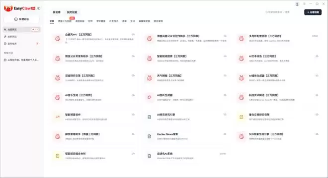 经我们测试发现,EasyClaw在左上角设置了三个入口,分别是技能商店、龙虾商店与定时任务。