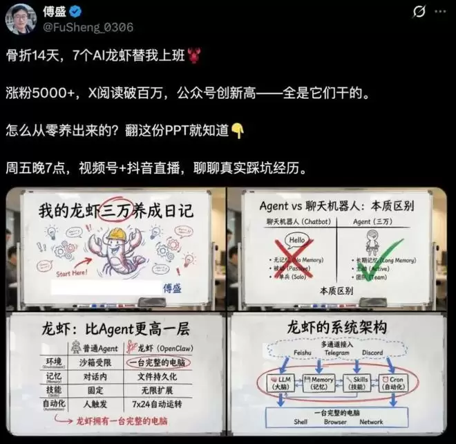 养出了三万的傅盛站在了“养虾”风潮的潮头,个人用户与企业组织能否也拥有同款三万,让AI为自己做事,给自己打工?