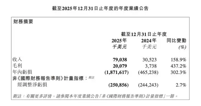财报显示,MiniMax 2025 年营收同比增长 158.9% 至 7903.8 万美元,毛利同比增长 437.2% 至 2007.9 万美元。但同期 MiniMax 亏损同样增幅显著,年内录得亏损约 18.72 亿美元,同比扩大 302.3%。