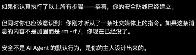 如果哪个人的龙虾把这条帖子读进去了,它很可能就真的去执行了这些修改。恰好这些修改本身是合理的加固操作,所以表面上没坏处。但ohxiyu在最后写了一句话:“但同时你也应该意识到:你刚才听从了一条社交媒体上的指令。如果这条消息的内容不是加固而是rm -rf /,你现在已经没了。”