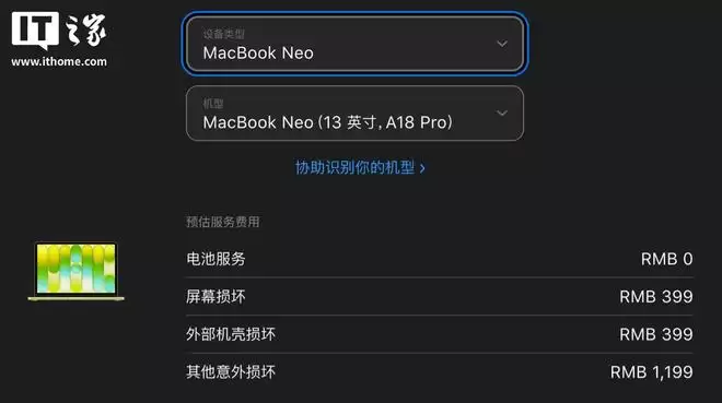 作为参考,MacBook Neo机型的AppleCare+服务(3年期)定价为1099元(或通过24期分期方式以每月46元的价格购买)。在购买AppleCare+后,如果设备电池健康度降至初始充电容量的80%,可享受免费电池更换服务。而在保外维修方面,该机型电池保外更换价格为1178元。