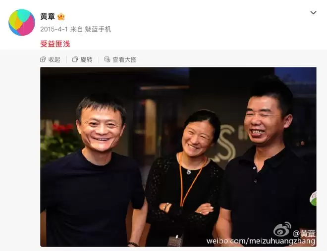 这一年的愚人节,马云在杭州的阿里总部接待了他刚刚投资过的团队,黄章亲自带领一众魅族高管与马云进行了一次长谈。鲜少露面的黄章发布了一张合影,自称"受益匪浅"。