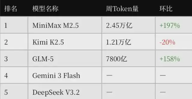 其中,MiniMax M2.5以2.45万亿token空降榜首,Kimi K2.5以1.21万亿紧随其后,智谱GLM 5和DeepSeek V3.2分列第三、第五。