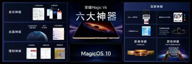 折叠屏手机一直不能成为大众选择除了门槛较高之外,另外一个原因就是在体验上没有什么让人眼前一亮的功能。这一次荣耀Magic V6绝对会让你直呼,原来还能这么玩。它带来了会议、理财、出国、影音、游戏、互联六大场景的“六大神器”软件体验。