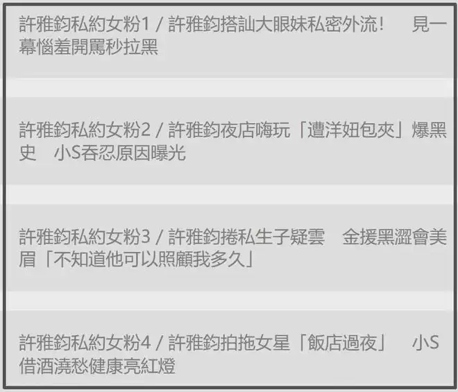 台媒光是回顾许雅钧的花边史,就写了4篇,不是被拍到出入高级招待所,就是被发现带多名辣妹出入夜店玩乐,还有和女星一同参加活动,入住同家酒店,早起还一起吃饭。