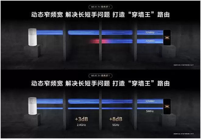 首先是动态窄频宽技术。当路由实时监测到终端回传的信号较弱时,会主动指令其将数据传输频宽从常规的20MHz智能压缩至5~10MHz,从而提升信号传输距离。经实测,2.4GHz频段信号强度提升3dB,5GHz频段信号强度提升8dB,让弱信号环境下的速率提升显著,实现“全屋无死角,信号满格在线”。