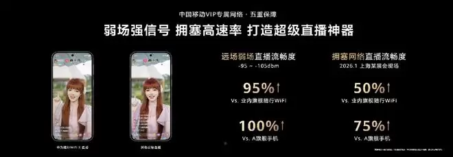 另外配合中国移动VIP专属网络·五重保障—— SUL技术双链路并行、智能小区选择、数据高优先级传输、VIP专属通道、直播专属速率保障,无论偏远户外还是人流密集区域,都能随时随地畅享流畅网络,真正做到弱场强信号,拥塞高速率。