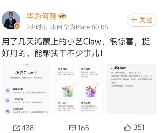 何刚在微博中透露,自己已经使用小艺Claw数日,并评价道:“体验非常惊喜,相当好用,帮我处理了不少事务!”