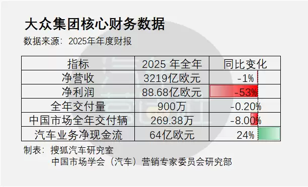 2025年,大众集团在全球汽车市场的表现呈现出复杂态势。财报数据显示,集团全年营收达到3219亿欧元,较上年微降0.8%;全年交付新车898.39万辆,同比减少0.5%;汽车业务净现金流达64亿欧元,同比增长24%。尽管收入和销量降幅不大,现金流表现稳健,但利润端却承受着巨大压力——营业利润为88.68亿欧元,同比下滑53%,营业利润率仅为2.8%。这一数据反映出,大众集团在2025年面临着严峻的盈利挑战。