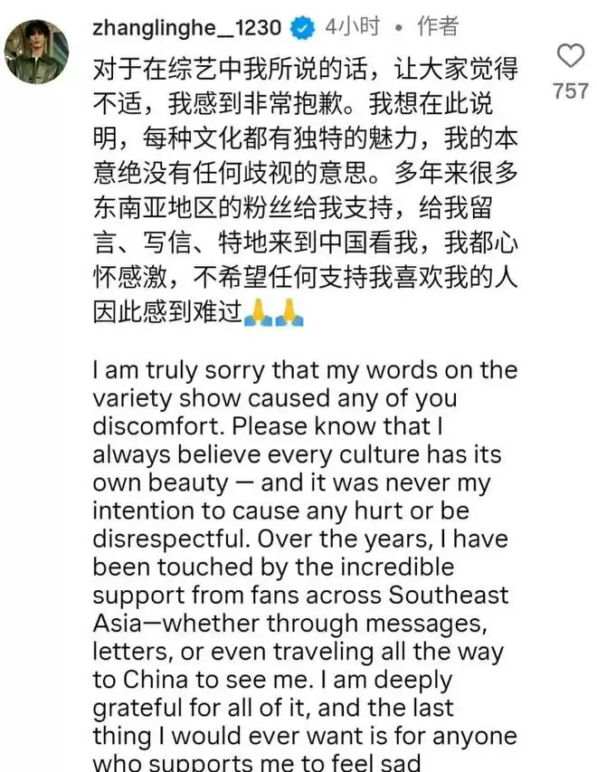 在东南亚网友这样的声音出现之后,张凌赫也是在第一时间出来道歉了。