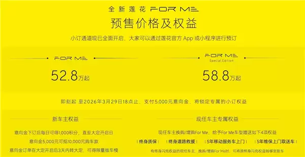 在预售权益方面,3月29日18:00前支付5000元意向金的用户,可享受每日1000积分奖励、购车款抵扣等优惠。针对莲花现有车主的增换购需求,品牌推出终身质保、终身道路救援、5年移动服务车上门维护及5年维保取送车等专属服务,进一步强化用户粘性。