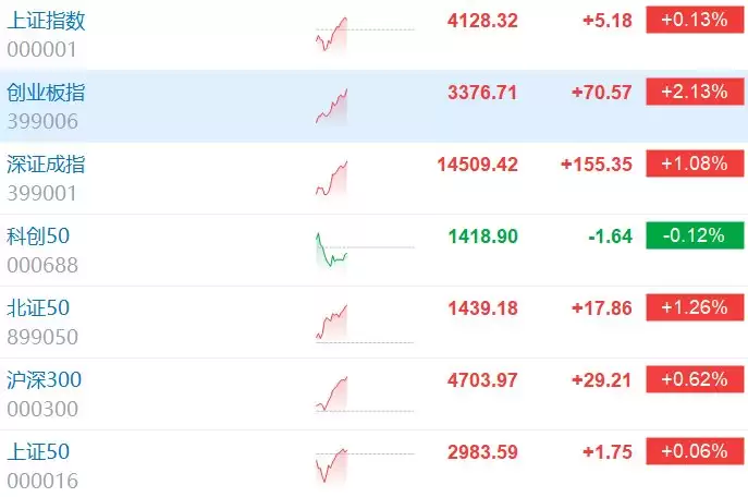 A股主要指数3月11日普遍上扬,沪指微涨0.13%,深证成指攀升1.08%,创业板指涨幅扩大至2.13%。光伏、锂电、算力硬件及算力协同等领域领涨,沪、深、京三市上涨个股接近2300只。
