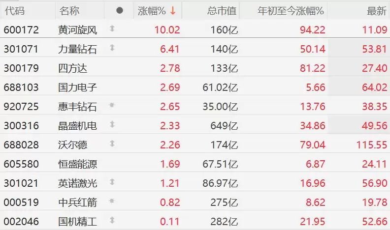 A股市场培育钻石概念股表现强劲,其中黄河旋风涨停,力量钻石涨幅超过6%,四方达、国力电子、惠丰钻石、晶盛机电、沃尔德涨幅均超过2%。