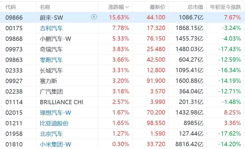 港股汽车股普涨 蔚来劲升逾15% 吉利涨超7%迎行情