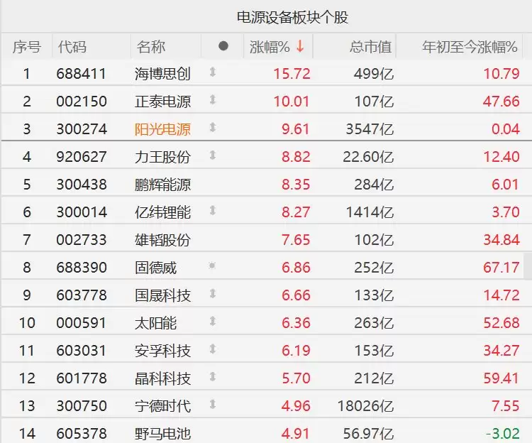 A股市场电源设备板块今日表现强劲,多只个股涨幅显著。其中,海博思创涨幅超过15%,正泰电源强势封板涨停,阳光电源上涨逾9%。力王股份、鹏辉能源、亿纬锂能等个股涨幅也超过8%,雄韬股份上涨7%。固德威、国星科技、太阳能、安顺科技等涨幅均超过6%,晶科科技上涨5%。宁德时代、野马电池等个股涨幅也超过4%。
