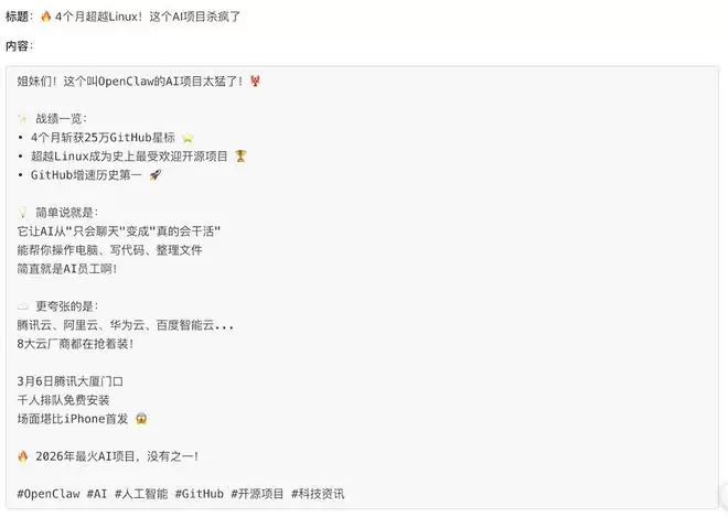 接下来,我想:能不能让它顺便把内容发到小红书?于是,我让WorkBuddy claw把整理好的OpenClaw资讯生成一篇小红书笔记。