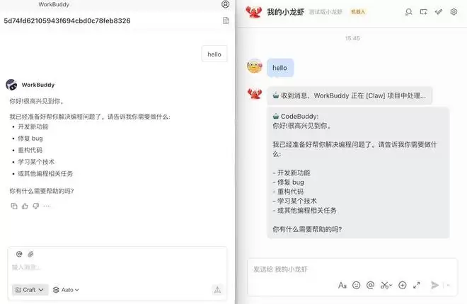 ▲WorkBuddy界面(左)与飞书界面(右)
