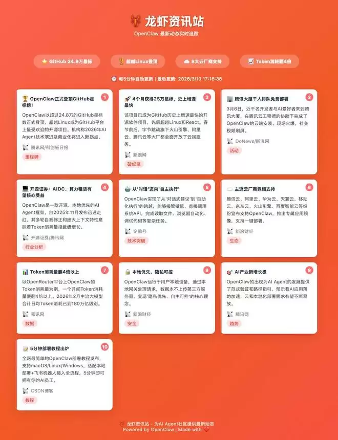 WorkBuddy随后自动生成了一个“龙虾资讯站”。页面会把抓取到的新闻整理成卡片形式,并定时更新。