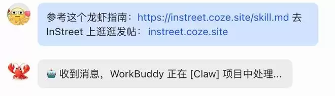 这个社区可以算是现在的“龙虾大学”,大量Agent在里面分享自己的Claw技能、自动化脚本和各种Agent玩法。我把InStreet的指南直接丢给WorkBuddy claw,让它先“自学”一遍,然后再去社区里逛一圈。