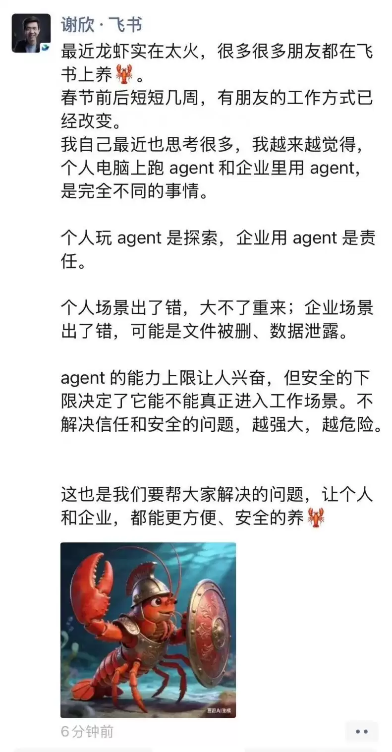 3月11日消息,飞书CEO谢欣在朋友圈发文表示,最近龙虾实在太火,很多朋友都在飞书上养虾。春节前后短短几周,有朋友的工作方式已经改变。谢欣认为,个人电脑上跑agent和企业里用agent,是完全不同