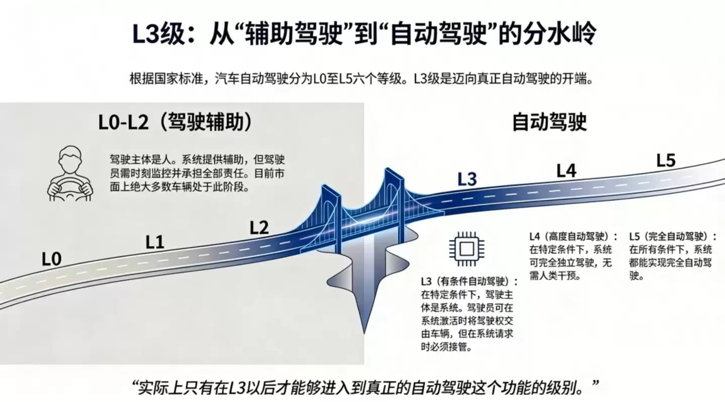 明确这一技术边界后,我们可以发现:L2到L4的技术跃迁,不是简单的功能叠加,而是从“辅助执行”到“自主决策”,再到“全自主+自兜底”,每一步都需要突破核心技术瓶颈。而L3的技术定位,恰好处于“辅助”与“全自主”之间,这也决定了它在技术迭代中的争议性。