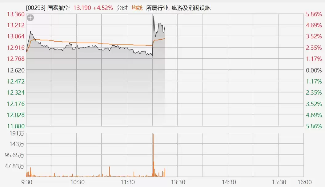 格隆汇3月11日|国泰航空(0293.HK)午后拉升,涨幅接近6%,报13.36港元。
