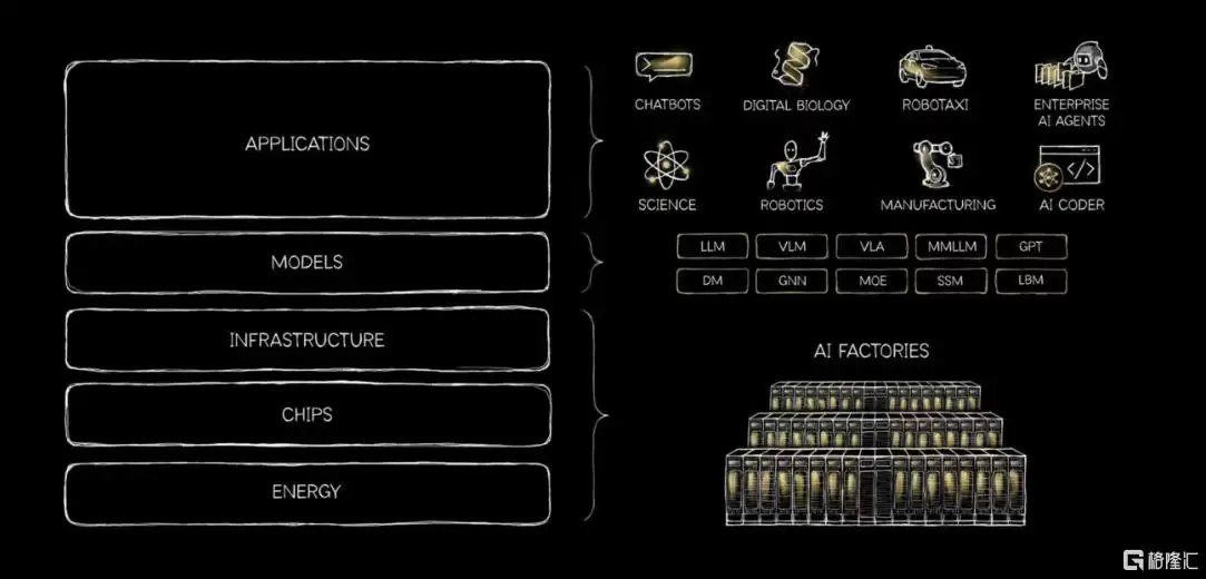 “这就是五层蛋糕:能源→芯片→基础设施→模型→应用。每一个成功的应用都会牵引其下的每一层,直至维持其运行动力源。”黄仁勋指出。
