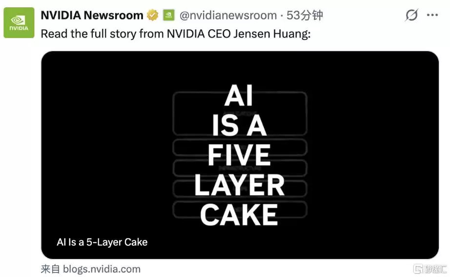 在博客中,黄仁勋明确提出了AI五层架构,成为行业共识框架。