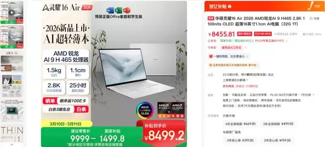 目前这款机型在京东火热售卖中,首发价9999元,部分地区可享受至高1499.8元国家补贴,到手价8499.2元起。
