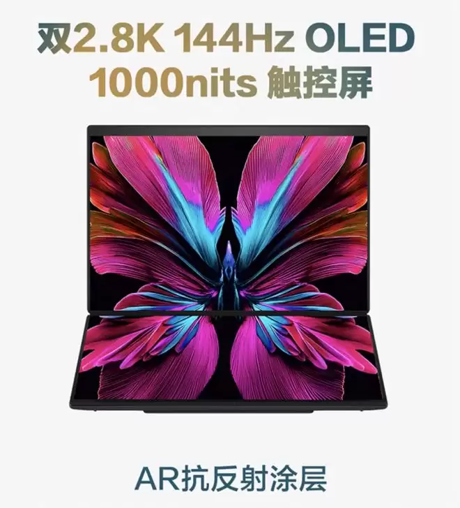 华硕灵耀14 双屏 2026采用可折叠双屏结构,同时配备两块规格完全一致的 14 英寸 2.8K 144Hz OLED 柔性触控屏,触控显示更细腻、更纯净,采用On-Cell无网格触控方案,观感清晰,柔性屏特性解决了传统OLED硬屏的彩虹纹痛点。屏幕覆盖康宁DXC2.0抗反射涂层,反射率约为1%-2%,无AR涂层的反射率约为4%-8%,做到强光下依旧清晰通透;100%P3 广色域、1000nits HDR峰值亮度,还原真实绚丽色彩;硬件级低蓝光认证加持,高刷屏畅快体验的同时,时刻呵护用眼健康。