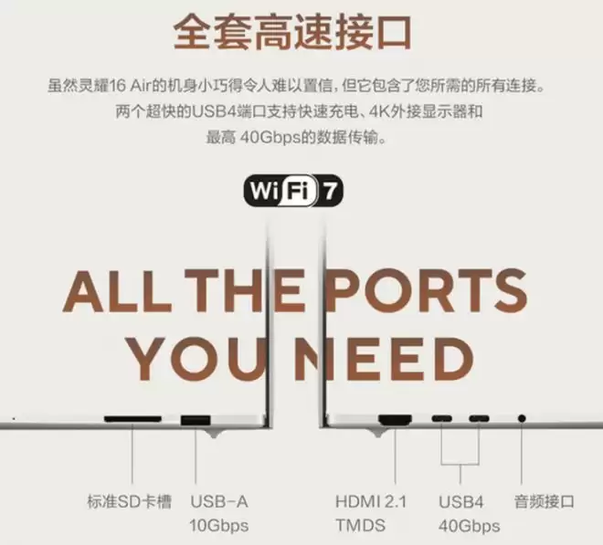 华硕灵耀16 Air 2026内置83Wh大容量电池,在华硕性能调校下,续航时间大大加强,本地1080P视频播放长达25小时。另外,虽然机身轻薄,但仍然提供了全套高速接口,双USB 4拥有快速充电、4K外接显示和至高40Gbps的端口传输速度。还有标准SD卡槽,此外HDMI 2.1 TMDS,轻松连接多种设备与显示器,扩展性强。